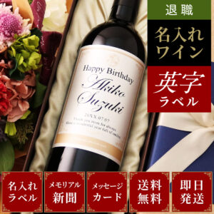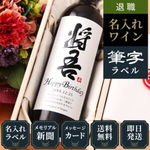 迫力のある筆文字でオリジナルワインラベルが作れます。ラベルにはお名前やメッセージ等お好きな内容を自由に記載可能。イラストや企業ロゴもOK。ワインは赤と白から選べます。入社日の新聞付きなので、退職祝いや…