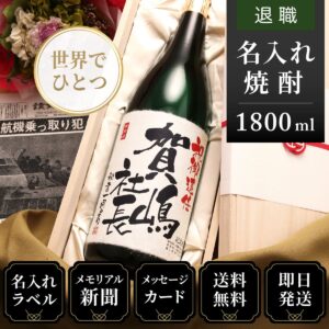退職のお祝いに贈る名入れ焼酎1升瓶サイズ。フルオーダーのラベルで感謝のメッセージが贈れます。企業ロゴやイラスト等も記載可能。珍しい酒粕焼酎に豪華金箔入り。入社した日の新聞付きでサプライズプレゼントに人…