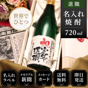 退職のお祝いに贈る名入れ焼酎四合瓶サイズ。ラベルには感謝のメッセージや企業ロゴ、寄せ書き等が自由に入れられます。華やかな香りの酒粕焼酎に豪華金箔入り。入社日の新聞付きで送別会が盛り上がります。無料ギフ…