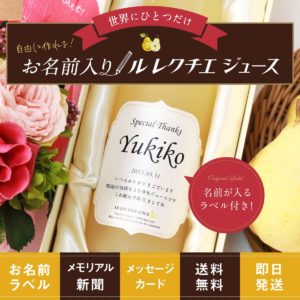 高級洋梨ルレクチエ100%ジュースにオリジナルラベルをお付けします。かわいいラベルにはお名前やメッセージを自由に記載できるので、退職や転勤のお祝いに感謝の言葉を贈るギフトとして人気です。入社した日の新…